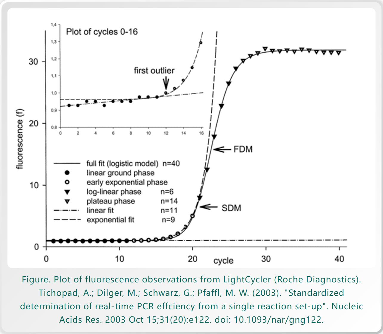 En el proceso de mejorar la eficiencia de la reacción enzimática y optimizar el valor de CT, primero se puede analizar una curva de amplificación cuantitativa de fluorescencia típica de ciclo PCR. La curva de amplificación en la figura a continuación se divide en fase de fondo de fluorescencia, fase de amplificación exponencial, fase lineal y fase de meseta. Para lograr un fondo de fluorescencia más bajo, en la medida de lo posible para distinguirlo del valor de fluorescencia de la amplificación exponencial temprana, es necesario probar el portador de consumibles de reacción, la detección de diseño de la sonda de cebadores y el sistema de tampón de reacción. El período de amplificación exponencial es la reacción más directa de la actividad enzimática, y también es la prueba de la coordinación perfecta del equipo POCT, los portadores de reacción y los reactivos. En este momento, el control de la temperatura del equipo, la adquisición y el análisis de la señal óptica, la biocompatibilidad del portador y el rendimiento del sistema de los reactivos deben ajustarse y probarse en todos los aspectos. Finalmente, se completa toda la amplificación, y los resultados deben presentarse mediante un riguroso algoritmo de datos para obtener un valor de CT razonable.