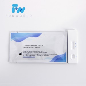 Pendant le processus de coagulation sanguine, le fibrinogène est converti en fibrine par l'activation de la thrombine. Les monomères de fibrine résultants polymérisent pour former un gel soluble de fibrine non liée à la croix. Ce gel de fibrine est ensuite converti en fibrine réticulée par le facteur xiii activé par la thrombine pour former un caillot de fibrine insoluble. La production de plasmine, la principale enzyme de caillot de caillot, est déclenchée lorsqu'un caillot de fibrine est formé. Bien que le fibrinogène et la fibrine soient tous deux clivés par la plasmine enzymatique fibrinolytique pour produire des produits de dégradation, seuls les produits de dégradation à partir de fibrine réticulés contiennent du D - dimère et sont appelés produits de dégradation de la fibrine à libellé. Par conséquent, les dérivés de fibrine dans le sang humain ou le plasma contenant du D - dimère sont un marqueur spécifique de la fibrinolyse. Le dispositif d'essai rapide du dimère D (sang total / plasma) est un test rapide qui détecte la présence de D - dimère dans le sang total ou les échantillons de plasma à la sensibilité de 500ng / ml. Le test utilise une combinaison d'anticorps monoclonaux pour détecter sélectivement des niveaux élevés de D-dim dans le sang total ou le plasma. Au niveau de la sensibilité revendiquée, la cassette d'essai rapide du dimère D (sang total / plasma) ne montre aucune interférence inter-réactivité de la troponine I associée, de la troponine T, du CK - MB, de la myoglobine ou d'autres à des niveaux physiologiques élevés